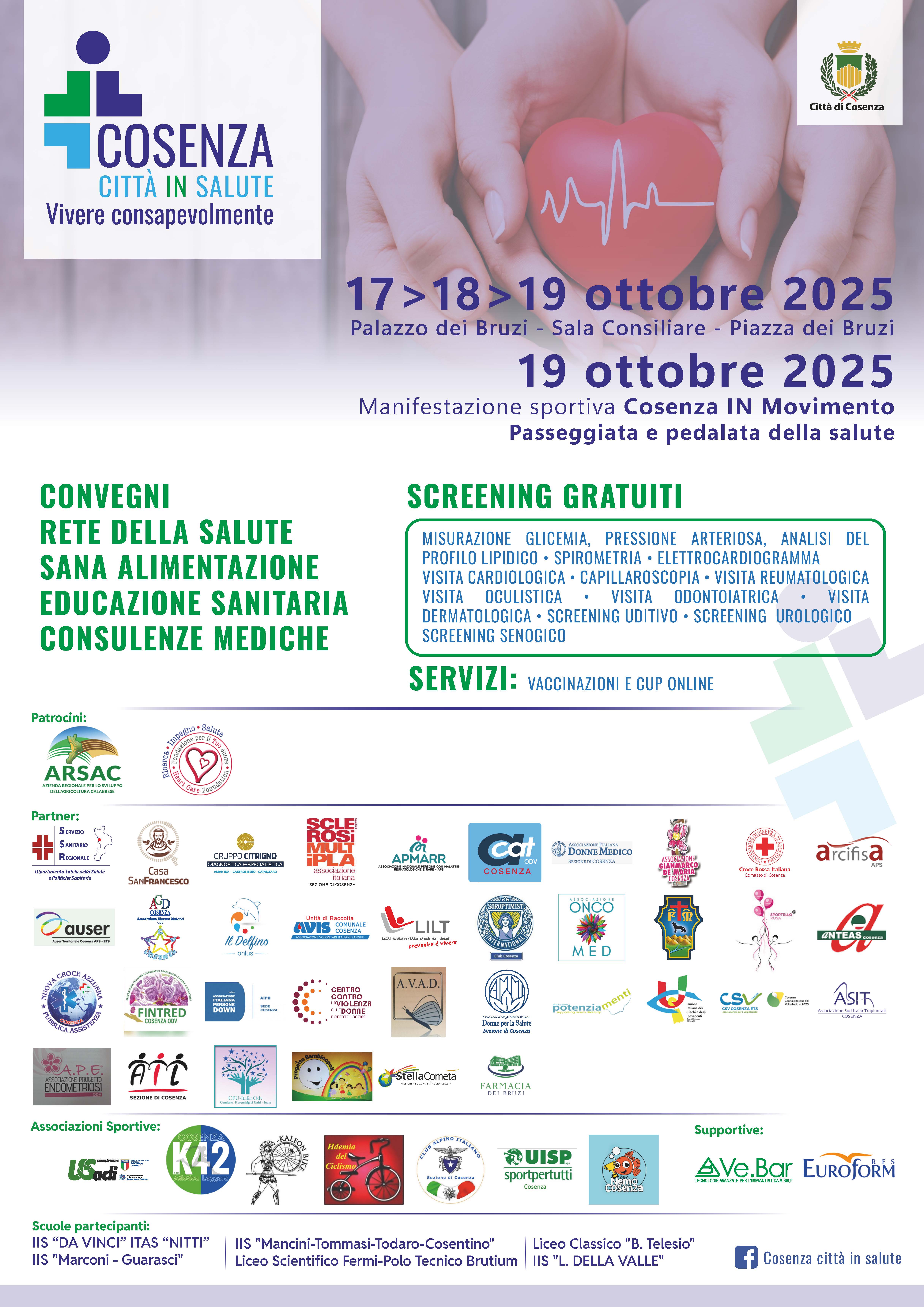 “Cosenza - Città IN Salute” è una manifestazione di tre giornate dedicate agli screening, all’informazione, alla promozione del concetto di salute e benessere, della corretta alimentazione e della conoscenza dei prodotti del territorio. Dal 17 al 19 ottobre 2025 dalle ore 9:00 alle ore 19:00 presso Area della Salute - Piazza dei Bruzi.