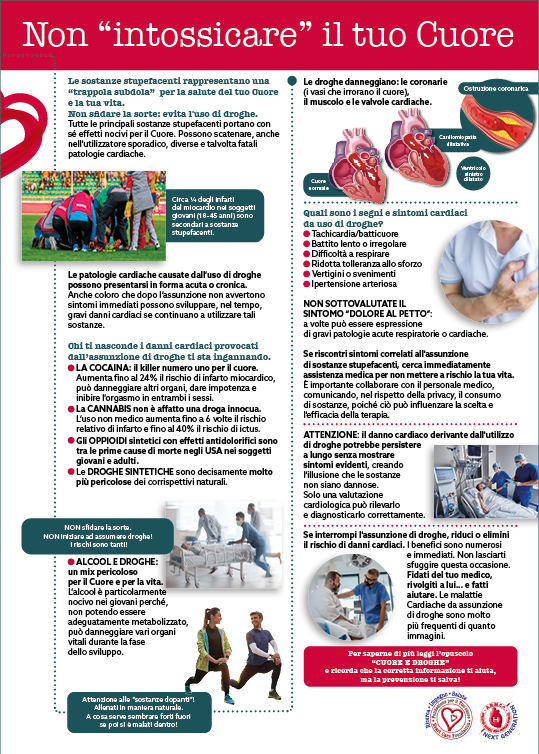 In quest’ottica la Fondazione ha avviato un progetto che preveda interventi conoscitivi, informativi e formativi rivolti a studenti e a docenti e finalizzati alla prevenzione dei rischi (con particolare riferimento ai rischi cardiovascolari) connessi al consumo di sigarette, alcolici e soprattutto di sostanze psicoattive legali o illegali ad uso voluttuario.